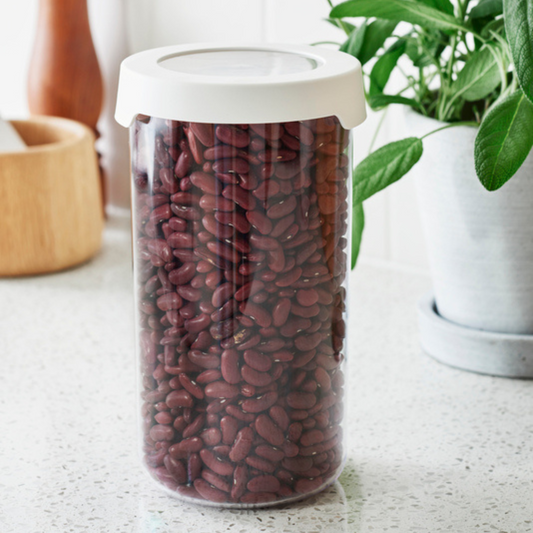 De voorraadkast blijft overzichtelijk en georganiseerd met slimme opbergoplossingen zoals stapelbare boxen, voorraadpotten en ladeverdelers, zodat je in één oogopslag ziet wat je in huis hebt.