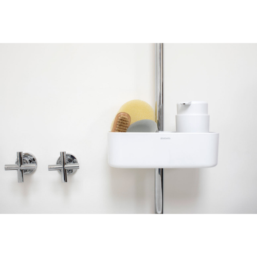 - Plaats je shampoo, zeep, sponsjes of scheermesjes in het rekje.