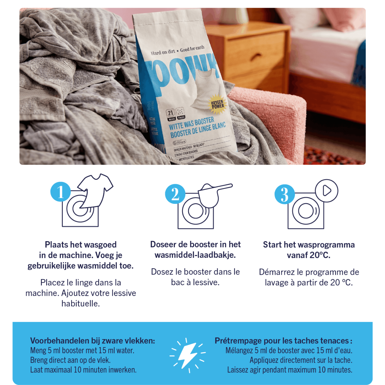 - Gebruik dit poeder samen met de POWR wasstrips (gekleurde,