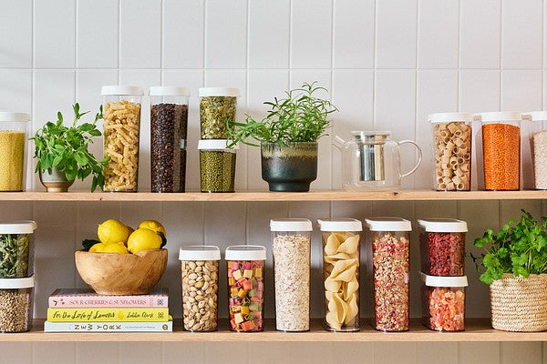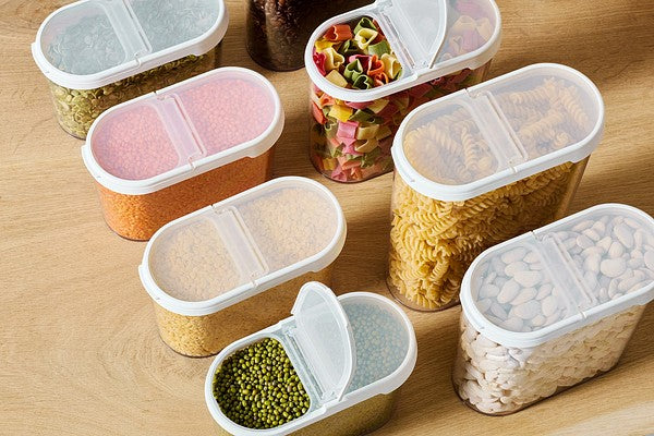 - Vul met droge voedingsmiddelen zoals bloem, suiker, havermout, rijst, noten of pasta