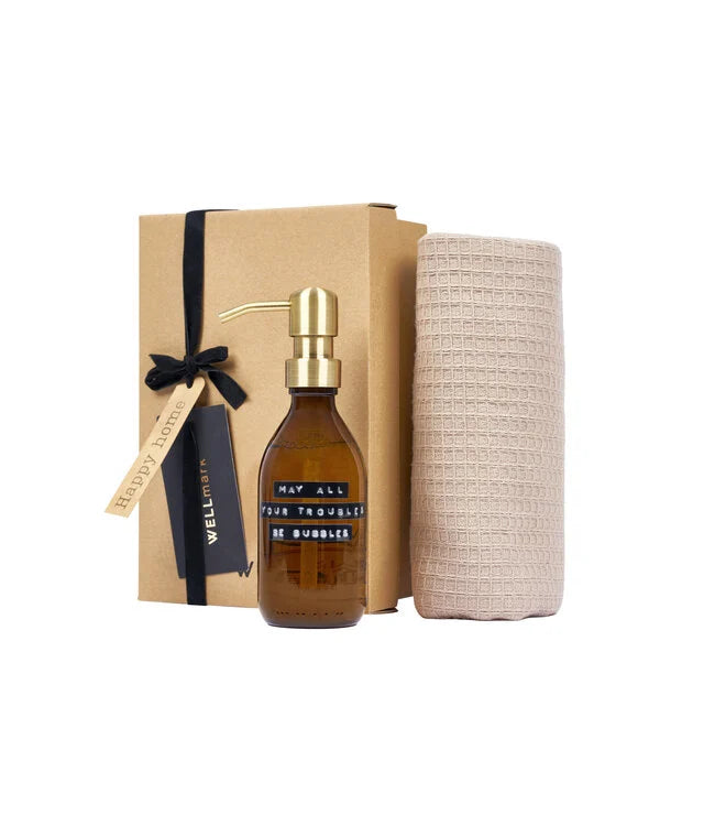 Op zoek naar een stijlvol en verantwoord cadeautje? De Giftset Happy Home is perfect voor een housewarming of verjaardag. Met een bamboegeur handzeep (250 ml) en een beige theedoek van biologisch katoen maak je elke Wellmark-fan blij.